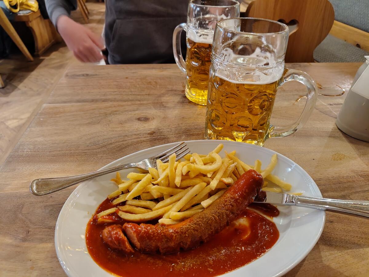 The next day, Sunday, was a bit rainy but we ventured into town and had some early beers. Josh disappeared off to get the dressing on his wound changed. The last two trips I’ve been on with Josh has resulted in him being hospitalised. The boy is a menace. Whilst Josh was away I tucked into some Currywurst, with my beer.